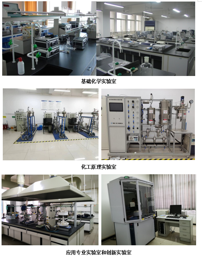 为保证教学需要,培养学生实际操作能力,实现理论与实践的紧密结合,本专业基础设施完备,可用于教学的实验室包括无机化学、分析化学、有机化学、物理化学四大基础化学实验室;应用化学专业实验室、应用化学创新实验室等专业实验室,配套设施先进、功能齐全。通过共享学院分析测试中心的扫描电子显微镜、X射线衍射仪、原子吸收、气质联用色谱仪等价值约两千万元的大型仪器设备,以及与校内其它实验中心(室)搭建资源共享平台,实现了实验资源的整合与优化配置,专业基础条件得到较大改善和提高。
