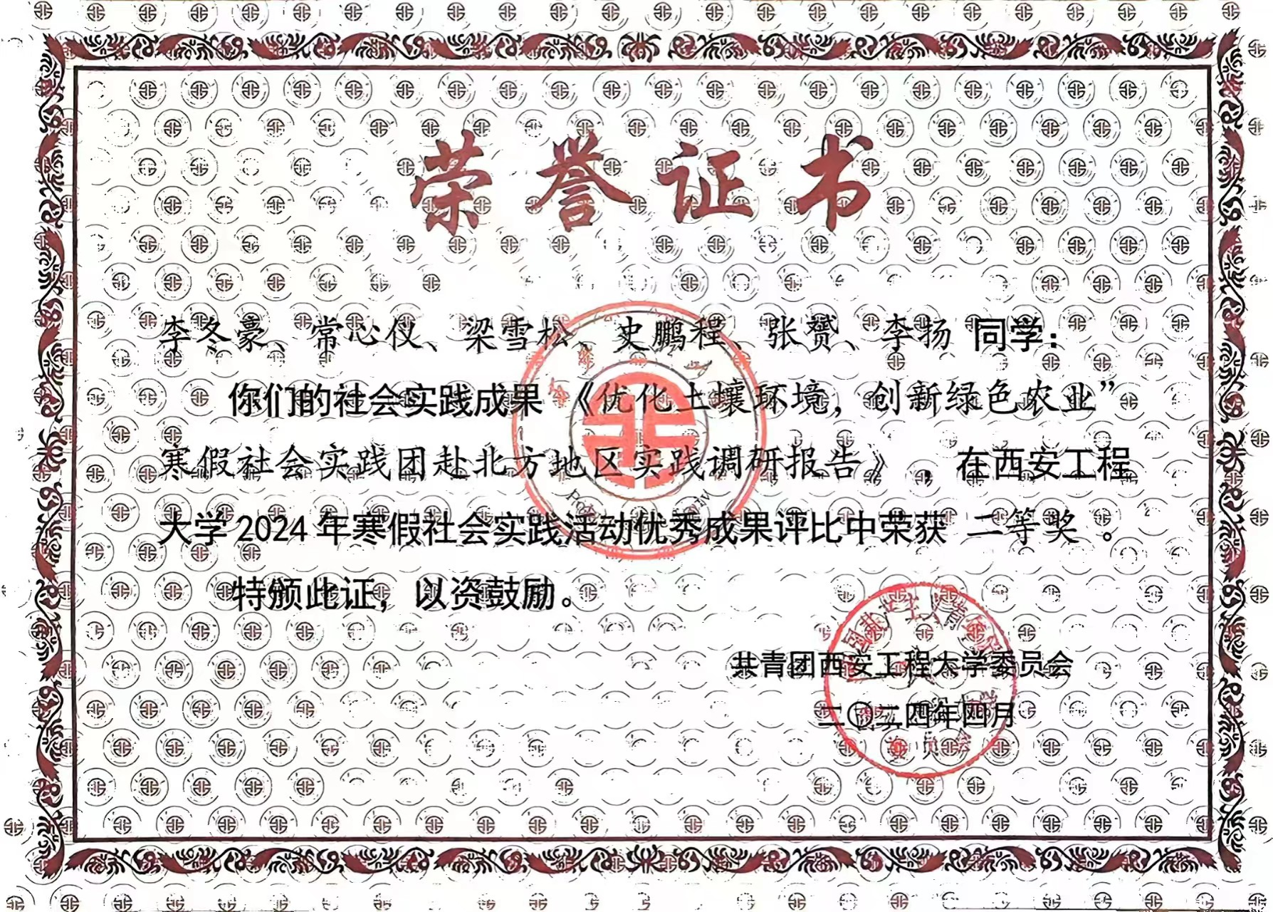 近日,西安工程大学2024年寒假社会实践活动的评选结果揭晓,我院“优化土壤环境,创新绿色农业”社会实践团队在众多参赛队伍中脱颖而出,荣获优秀服务队和优秀成果。“优化土壤环境,创新绿色农业”团队由我学院李冬豪同学带队,队员有常心仪、梁雪松、史鹏程,张赟同学,其中,常心仪和张赟同学荣获“先进个人”的称号。团队指导老师何艳慧老师。