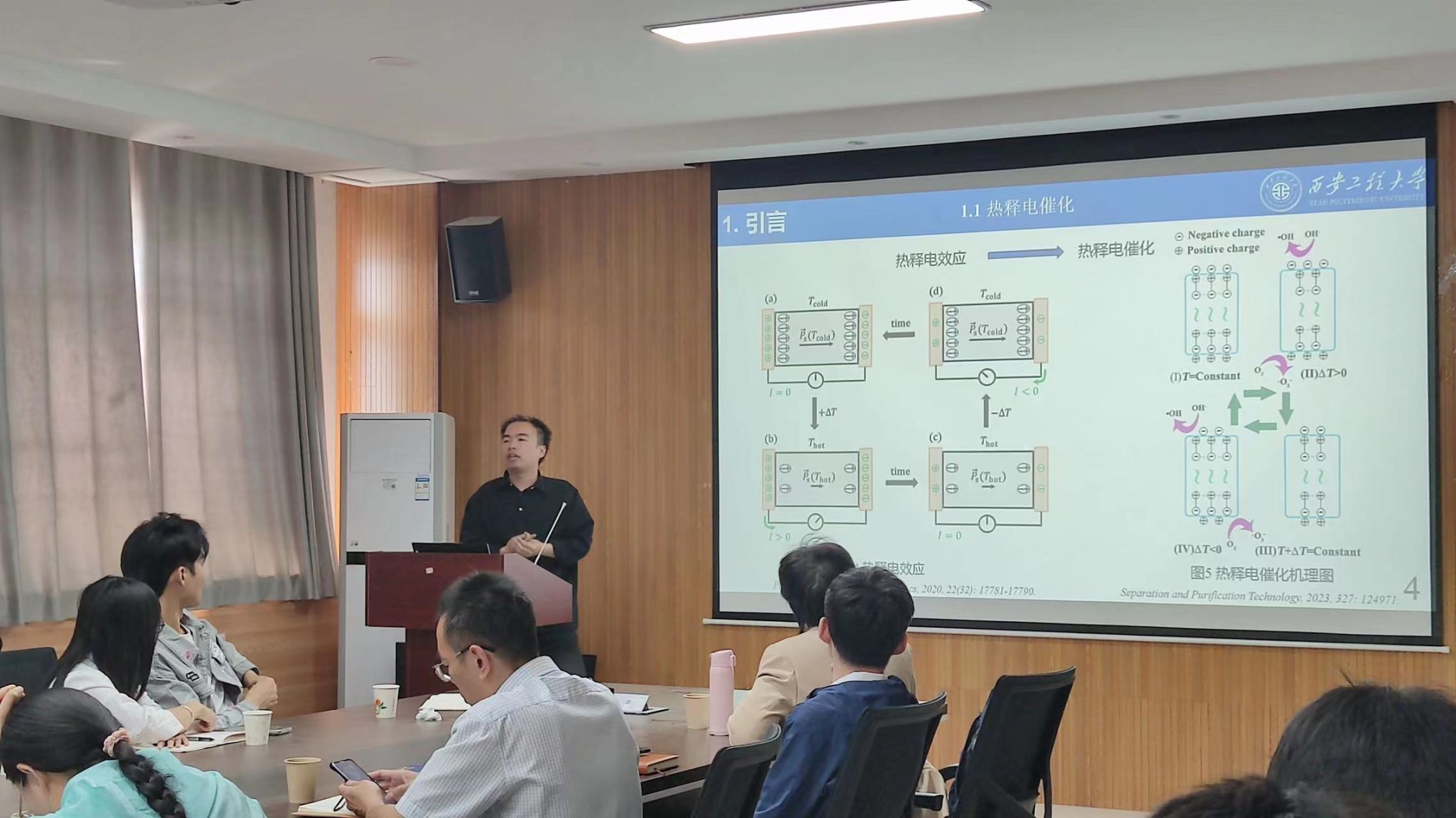 许涛声同学的报告题目是《新型热释电催化和摩擦催化降解染料废水》。他向介绍了BaTiO3/Pr2O3纳米纤维可以有效收集温度波动产生的热量实现热释电催化降解染料,构建异质结可以有效提升BaTiO3的热释电催化降解染料性能;以及Ag/g-C3N4可以有效收集机械能实现摩擦催化降解染料,在g-C3N4上负载贵金属Ag可以有效提升其在摩擦催化降解染料中的性能。