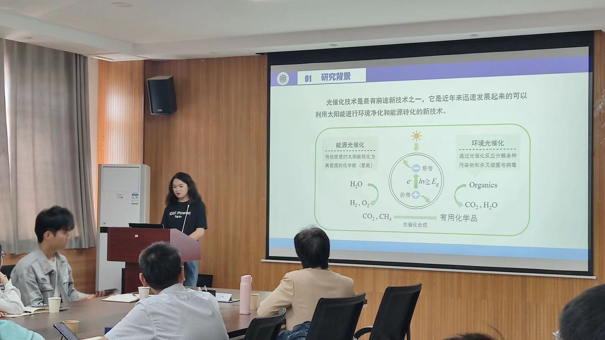 刘甜同学的报告题目是《结构空位缺陷修饰的双原子层石墨相氮化碳纳米片的设计合成及其性能研究》。她介绍了通过真空处理改善了石墨相氮化碳可见光吸收有限的缺点,并且改性后的g-C3N4光催化产氢、降解性能得到较大提升,且具有优异的稳定性,为实现未来的可持续能源提供了新的思路。