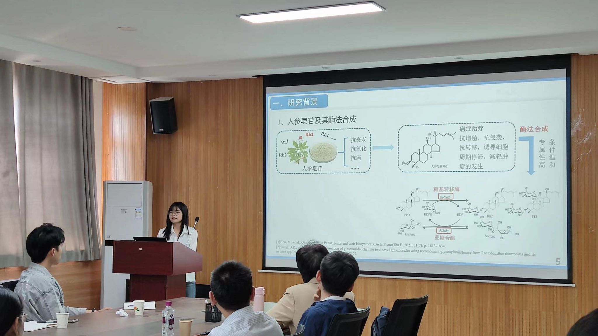 李志燕同学的报告题目是《共固定化糖基转移酶和蔗糖合酶偶联催化转化稀有人参皂苷Rh2研究》。她分享了Zn-Ni MOF对糖基转移酶的特异性吸附来实现酶的固定化;并进一步通过更换配体对MOF改性;利用酶特有的级联反应固定化双酶,进一步提升稀有人参皂苷Rh2的转化率;
