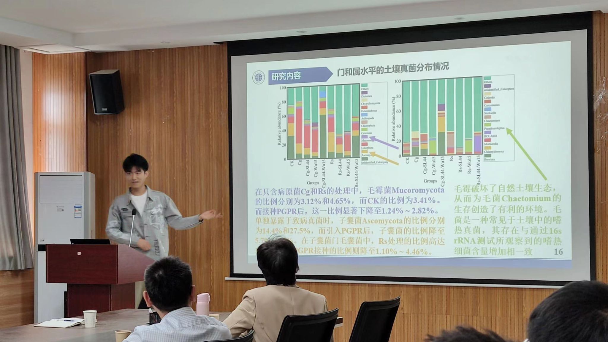 王建稳博士做了《枯草芽孢杆菌SL44与霍氏肠杆菌Wu15联合防治植物病害的研究》主题报告,他围绕“多种根际促生菌在大田应用中难以达到预期的协同稳定效果”这一问题,分享了自己所筛选的SL44和Wu55两种根际促生菌在植物防病上体现了很好的协同效应,并分析了两种PCPR的作用机理;有效抑制了土壤真菌对植物的病害。