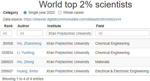 2023年10月4日,美国斯坦福大学团队与全球最大学术出版商爱思唯尔(Elsevier)发布了全球前2%顶尖科学家榜单(World's Top 2% Scientists)(https://jokergoooo.shinyapps.io/top2pct_scientists/)。我院武占省教授、李云锋教授和武峥校聘教授入选。该榜单基于Scopus的数据,使用了六种关键指标综合评估来进行打分。主要指标如下:1)总引用量,2)Hirsch指数(H-index),3)共同作者修正的Schreiber指数(Hm-index),4)单独作者的,5)单独或者第一作者的,6)单独、第一或者通讯作者的文章引用量。榜单《2023年度科学影响力排行榜》(single-year impact)对应于上一年度(2022-2022)时间区间的综合数据。该榜单从科学家视角多维展示科研状态的一种探索,旨在提供了一个科学家长期科研表现的衡量指标,能较为客观真实地反映科学家在全球范围的影响力及为相关领域发展作出的杰出贡献。