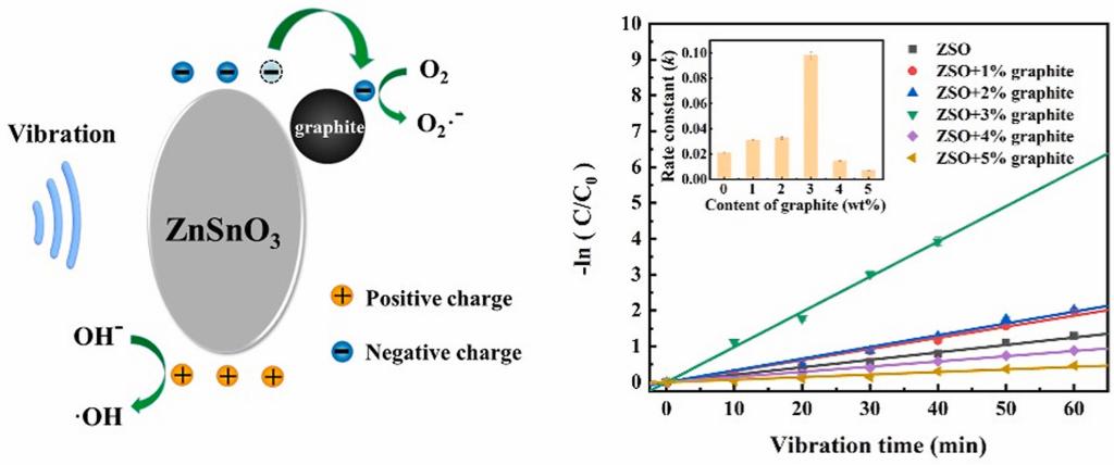 近日,我院武峥博士课题组在新型压催化降解染料废水方面再次取得新进展,相关成果发表在Ceramics International (49, 29614, 2023) (IF=5.2,中国科学院SCI一区)。题目为“Strongly enhanced piezoelectric-catalysis of ZnSnO3/graphite hybrid materials for dye wastewater decomposition”。武峥博士为第一作者,硕士生范保喜为第二作者。西安工程大学yl6809永利官网为第一单位。本工作中,通过溶胶凝胶法合成了压电锡酸锌纳米材料,并在其中混合一定比例的导电石墨,用于加速压电诱导的载流子的迁移,从而获得提高了的压催化性能。在混合石墨比例为3%时,压催化效果达到最优,对罗丹明B染料溶液的降解率达~100%,反应速率常数为~0.098 min-1,远高于纯锡酸锌催化剂对罗丹明B染料溶液的降解率~73%和反应速率常数~0.021 min-1。该压催化剂在纺织印染废水中处理中具有重要的应用前景。
