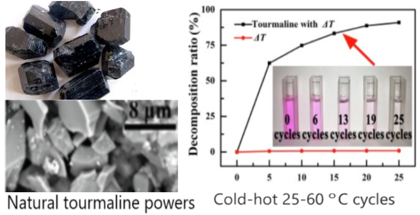 近期,我院武峥博士课题组在室温热催化方面取得新进展。实现了在室温冷热变换下利用天然矿物材料降解染料废水,相关研究成果以题目“Natural tourmaline for pyroelectric dye decomposition under 25–60 °C room-temperature cold-hot fluctuation”发表在环境领域著名期刊Separation and Purification Technology(327, 124971, 2023; IF=8.6)。武峥博士为第一作者,硕士生许涛声为第二作者。西安工程大学yl6809永利官网为第一单位。电气石(Tourmaline)是以含硼为特征的铝、钠、铁、镁、锂的环状结构天然硅酸盐矿物。电气石是一种天然的热释电材料。本工作中,武峥博士课题组采用天然电气石矿物粉末材料作为催化剂,在室温25-60摄氏度冷热循环激励下,经历25次冷热循环,罗丹明B染料的降解率可达84.7%左右。我国电气石资源丰富、分布范围广泛、矿产品质优良、价格便宜。本工作是国际上首次采用天然矿物作为室温热催化剂并用于染料废水降解方面的研究报道。未来有望利用廉价的天然电气石矿物材料实现在环境冷热变换(例如昼夜温差)激励下实现大规模的纺织印染废水处理。