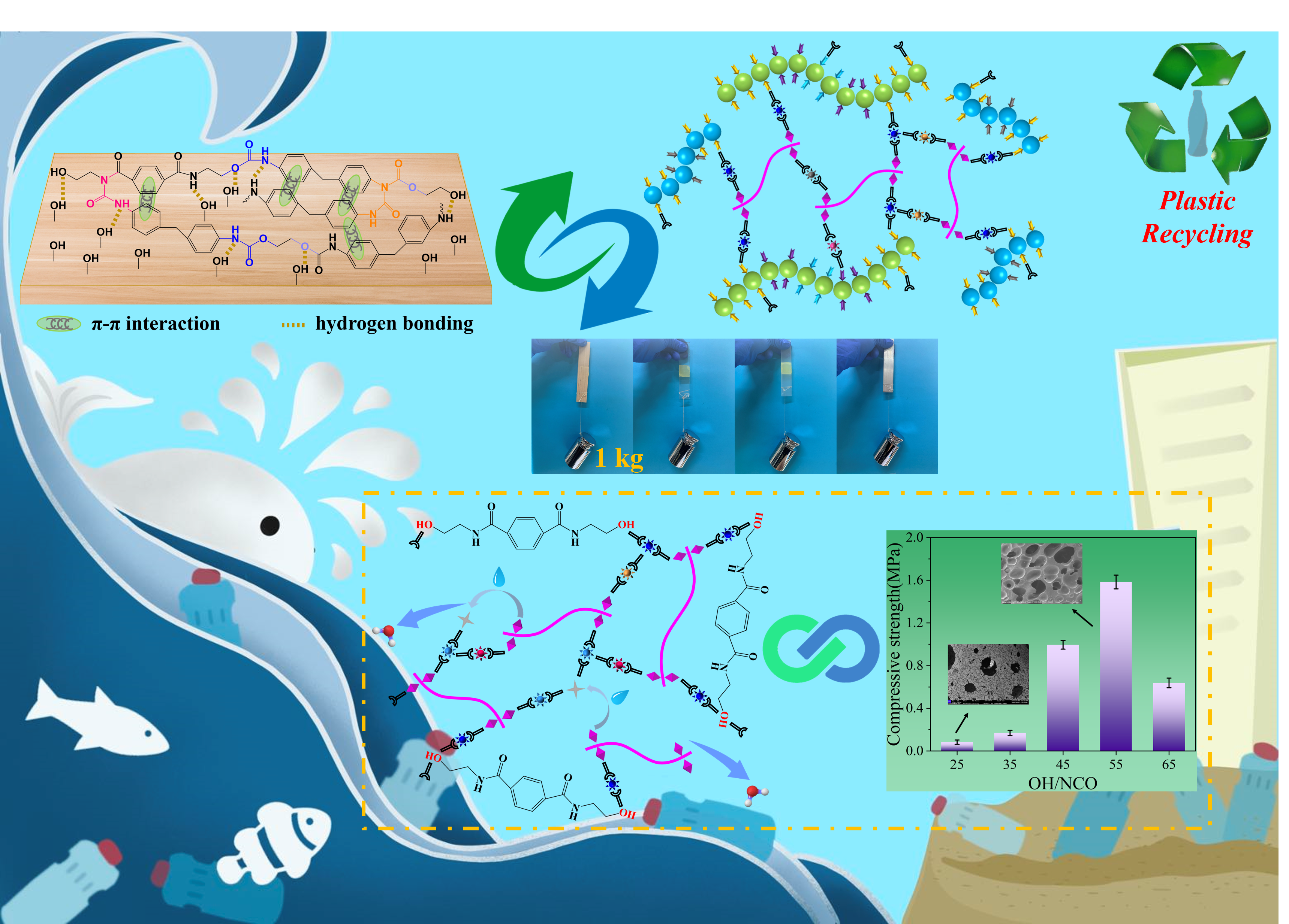 本研究所设计的对苯二甲酰胺BHETA基胶粘剂在水、有机溶液及各种恶劣条件下均表现出稳定附着力,并在此基础上,提出了基于胶粘剂分子与胶粘剂-基质界面间多重氢键机制的P-PUa胶粘剂,该胶粘剂在氢键与-堆积作用驱动下表现出优异的粘接性能(2.5 MPa),在多次循环后力学性能没有明显衰减,并且可作为水下密封材料。利用BHETA的多功能基团和二苯基甲烷二异氰酸酯(MDI)的刚性结构,制备了具有丰富交联结构的高密度硬质泡沫,展现出良好的抗压缩强度(2.1 MPa)和耐久性。该研究通过绿色、节能的方法将废旧PET转化为高附加值和高性能材料,这为纺织品废弃物的升级回收和实现工业化应用提供了新的思路。