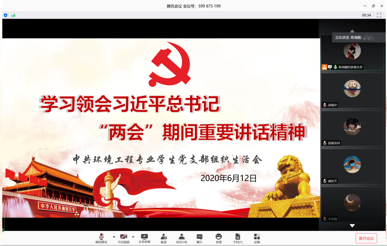 2020年6月12日下午16时,环境工程专业学生党支部召开组织生活会,学习习近平总书记“两会”期间重要讲话精神。会议由党支部书记邵瑞华老师主持,党支部25名同志参加了学习讨论。
