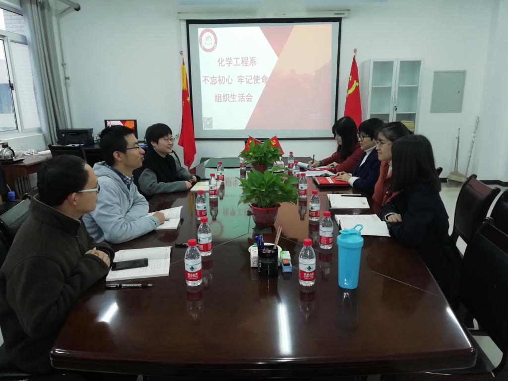 2019年10月24日上午,yl6809永利官网化工系党支部在yl6809永利官网506会议室召开了“不忘初心、牢记使命”主题生活会。支部书记杜燕萍同志根据党中央的要求,向青年教师党员们强调了立德树人的重要性,督促大家进一步学习习近平关于对高校教师的党建要求。并进一步深入讨论了“双创”支部的建设要求,对照职责进行了详细分工,党员们表示会以饱满的热情积极参与“双创”支部的建设。