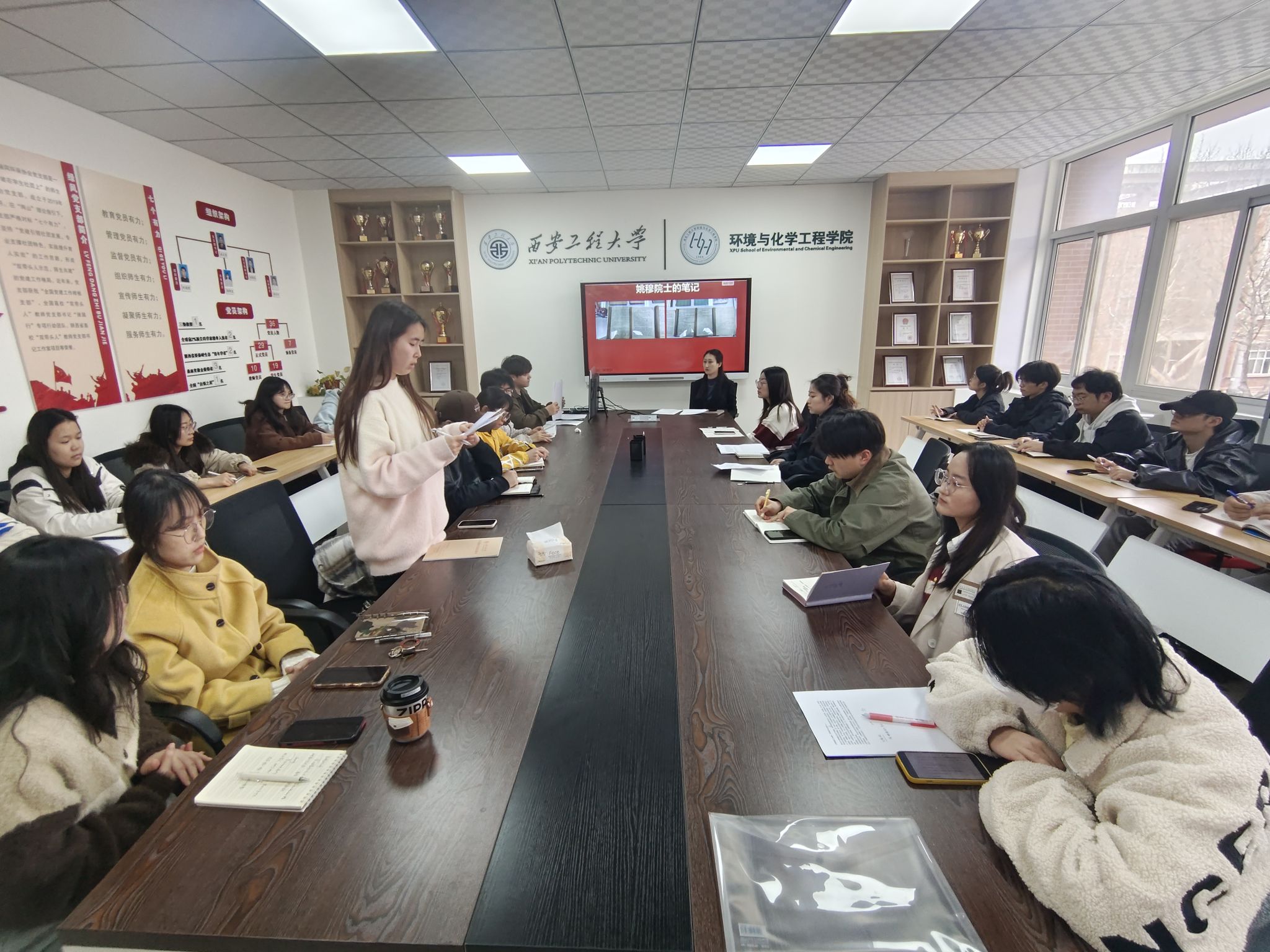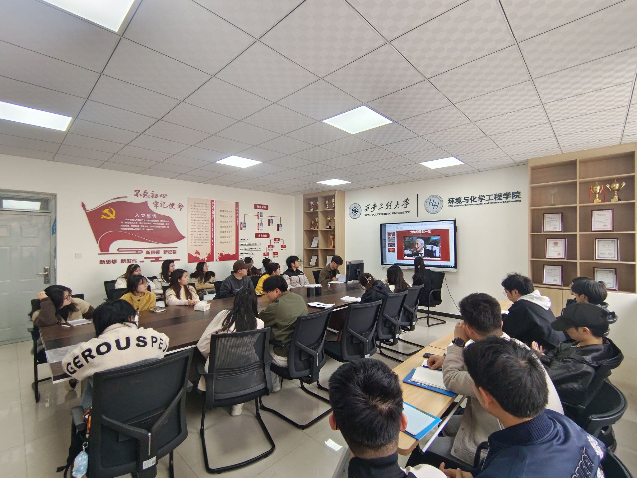 会上传达了《中共西安工程大学委员会关于开展向姚穆同志学习的决定》文件精神,播放了《纺织报国志丹心育桃李》专题纪录片,展示了姚院士生前珍贵手稿、工作笔记,生动再现其扎根西部六十载、科教报国守初心的奋斗历程。这些画面记录了姚穆院士在平凡岗位上默默坚守、无私奉献的瞬间,都承载其高尚的精神品格,激励着每一位党员不忘初心、砥砺前行。