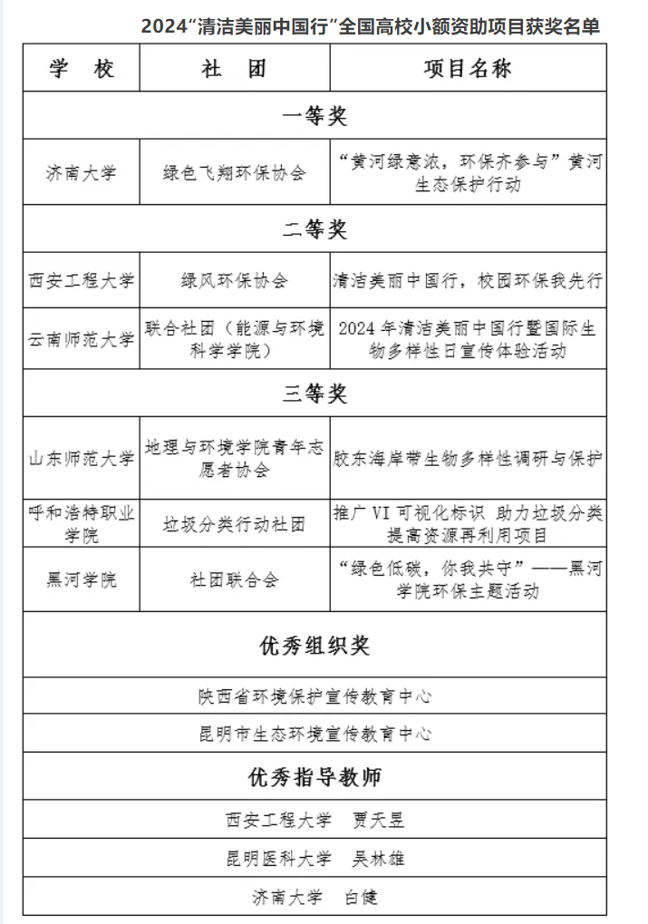 近日,由生态环境部宣传教育中心和花王(中国)投资有限公司共同主办的2024“清洁美丽中国行”全国高校小额资助项目获奖名单揭晓,我院绿风环保协会积极组织申报,认真开展工作,于11月底前提交了总结,经专家终审,最终在来自全国26个省(市、自治区)102所高校的155个社团中脱颖而出,荣获二等奖(全国第二名),协会指导教师贾天昱荣获优秀指导教师称号(共3人)。