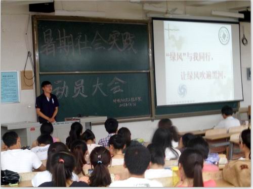 大会首先对暑期社会实践做了简要介绍,观看了学院近三年的暑期社会实践活动视频。之后,绿风协会会长张盼同学介绍了我院绿风协会在2012年暑假组建的“黑河行动”调研小组活动情况;李柯同学讲述了自己组织和参与2012年“暑期甘肃保护绿地”的亲身体会;王璐倩同学介绍了2012年暑期“延安支教”的亲身经历。最后,欧阳永强就2013班级立项和各组织立项申报工作做了安排,他鼓励同学们积极投入到2013年的暑期实践中去。