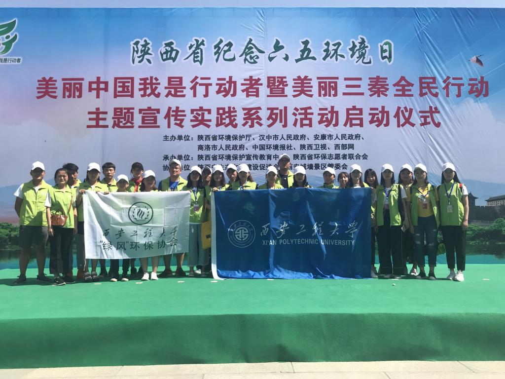 2018年6月5日,在第47个世界环境日当天,yl6809永利官网研究生与“绿风”环保协会志愿者等50名学生在西安南门广场参加了由省环保厅、汉中市政府、安康市政府、商洛市政府等主办的“美丽中国我是行动者暨美丽三秦全民行动”主题宣传实践系列活动启动仪式。陕西省副省长陈国强、陕西省人民政府副秘书长王晓驰等十一位领导为西安工程大学参与学生授予旗帜并颁发了志愿者督导证。环化“绿风”环保协会围绕主题,开展了“美丽中国,我是行动者”系列活动。