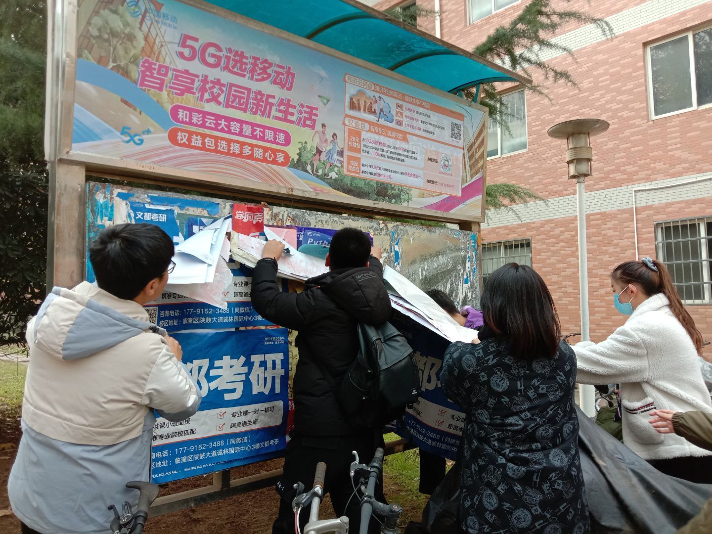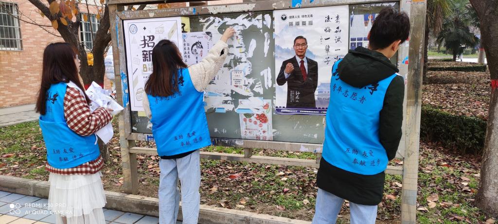 活动伊始,由各组组长组织签到,并告知队员一些安全注意事项,对其进行明确分工。拿到工具后,各组按照指定安排开展工作。尽管天气微凉,但同学们热情不减,努力把自己的工作做好。在打扫宣传栏的过程中遇到许多难题,如宣传栏灰尘的清理,玻璃的擦拭等,但在摸索中他们逐渐理清头绪,清理工作步入正轨。全体志愿者以手撕或工具清理广告、海报,并进行垃圾分类,配合默契、踏实肯干、参与积极,充分展现不怕苦、不怕脏、不怕累的志愿精神。最后,参与人员整理工具并在集合地点合影留念。至此,本次清扫宣传栏活动圆满结束。