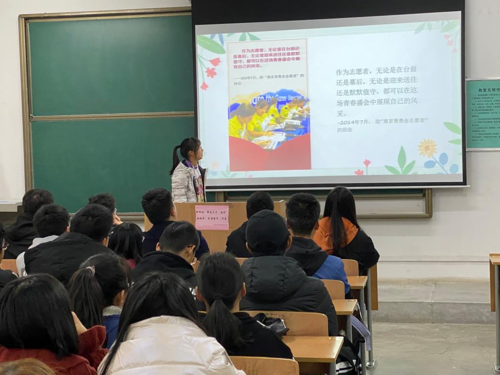 会议伊始,杨瑞楠介绍了本次会议的主要流程,并且宣讲了习近平总书记对志愿者的寄语。随后进行各代表发言,教师代表贾天昱表达了对志愿者们的支持和鼓励。张润泽、张振华和苟成龙提出,各位班级志愿者及青分队的成员们应当更加清楚的了解志愿者所应该具有的品质和精神。大会最后,各位志愿者齐唱志愿者之歌,并进行宣誓。志愿者们用歌声和宣誓声表达出自己对志愿服务的热爱,展现了自己想成为一名合格志愿者的决心。