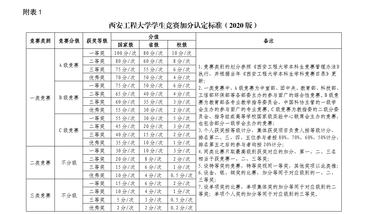 附表:1. 西安工程大学学生竞赛加分认定标准(2020版)