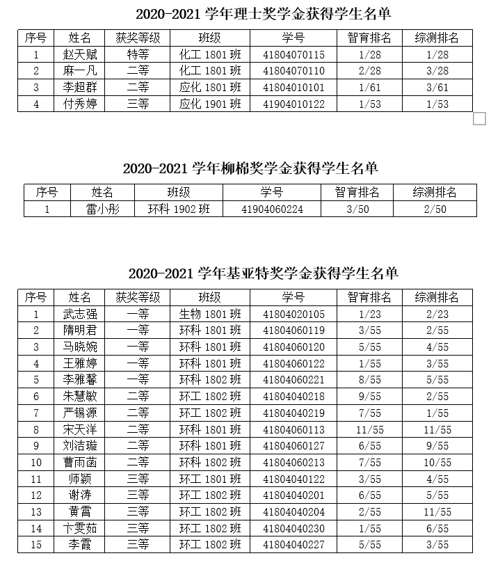 根据《西安工程大学国家奖学金管理规定》及《关于开展2020-2021学年各类社会专项奖学金评审工作的通知》相关要求,本着公平、公正、公开的原则,经学生申请,年级推荐等程序,经学院资助工作领导小组会议研究决定,拟推荐赵天赋等4位同学为2020-2021学年理士奖学金获得学生,雷小彤同学为2020-2021学年柳棉奖学金获得学生,武志强等15位同学为2020-2021学年基亚特奖学金获得学生。具体名单见附件,公示时间3天(2021年10月13日-2021年10月15日)。