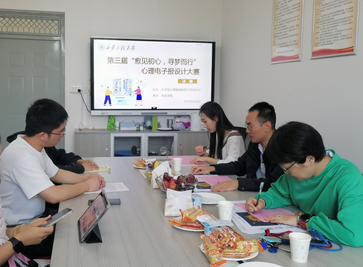 为深入贯彻我校《2023年心理育人宣传季实践活动》文件精神,进一步提升我校心理育人工作质量,全面优化大学生积极心理素养,由西安工程大学大学生心理健康教育与咨询中心主办、yl6809永利官网承办的第三届“俞见初心,寻梦而行”心理电子报纸设计大赛,于5月30日下午在yl6809永利官网238会议室举办。我校大学生心理健康教育与咨询中心主任刘蓉,学院副书记林定武,心理辅导员任子瑜担任此次大赛评委。本次大赛由任子瑜进行主持。