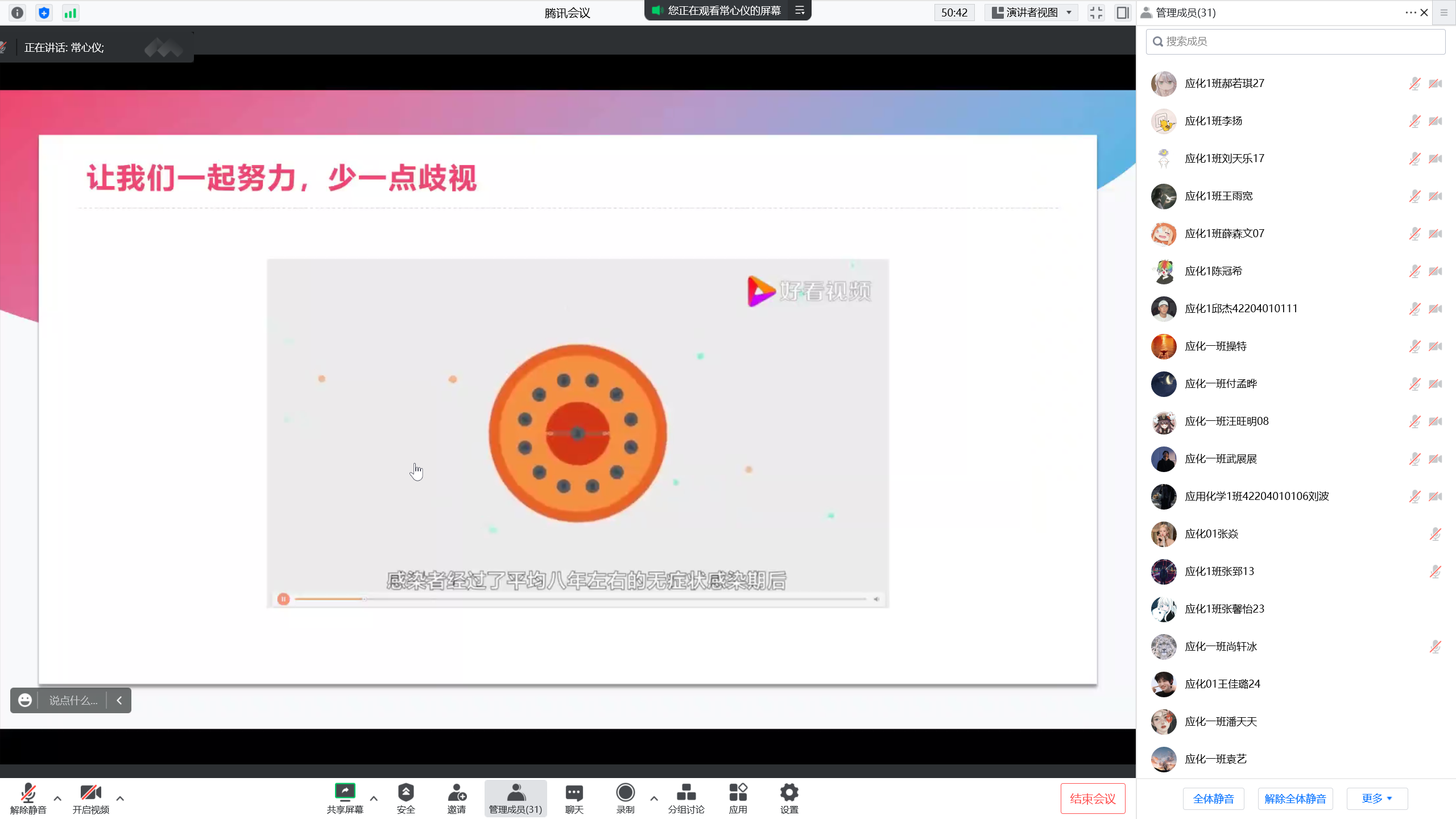 此次班会中,各班主讲人针对学生对艾滋病知识匮乏、预防知识了解片面和自我保护意识淡薄等情况,深入浅出的讲解了艾滋病的致病原理、发病症状、传播途径、防治措施以及国家对艾滋病“四免一关怀”政策等相关知识,以生动的实例和具体的数据,让同学们深刻了解有效防治艾滋病的具体措施以及学生在防艾工作中的重要作用。