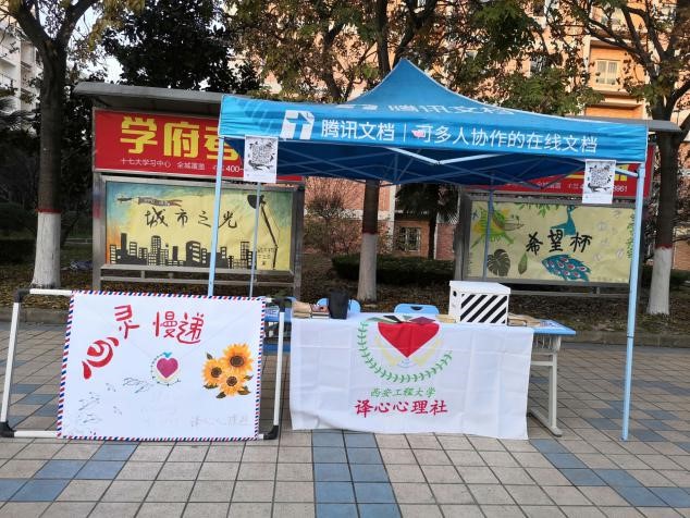2019年12月06日14:00在西安工程大学临潼校区中心广场,由我院译心心理社主办的“心灵慢递”活动圆满结束。同学们热情参与,这足以说明很多人心中,总有那么几句话是对某个她或他说的,是难以启齿的。译心心理社的社员们非常热情且友好,用心对待每个参加活动的同学,坚持做到尽心尽力。