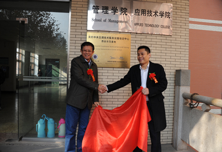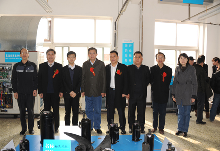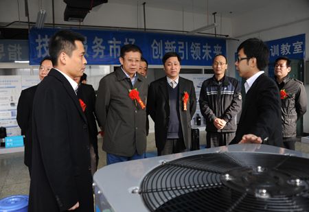 高勇校长和美的中央空调陕西分公司大型机经理刘凯共同为“美的中央空调技术服务实操培训中心西安示范基地”揭牌。揭牌仪式结束后,高勇校长、黄翔副校长、李鹏飞助理等参观了示范基地,高勇校长对“美的实操培训中心基地”的建立给予了充分的肯定。