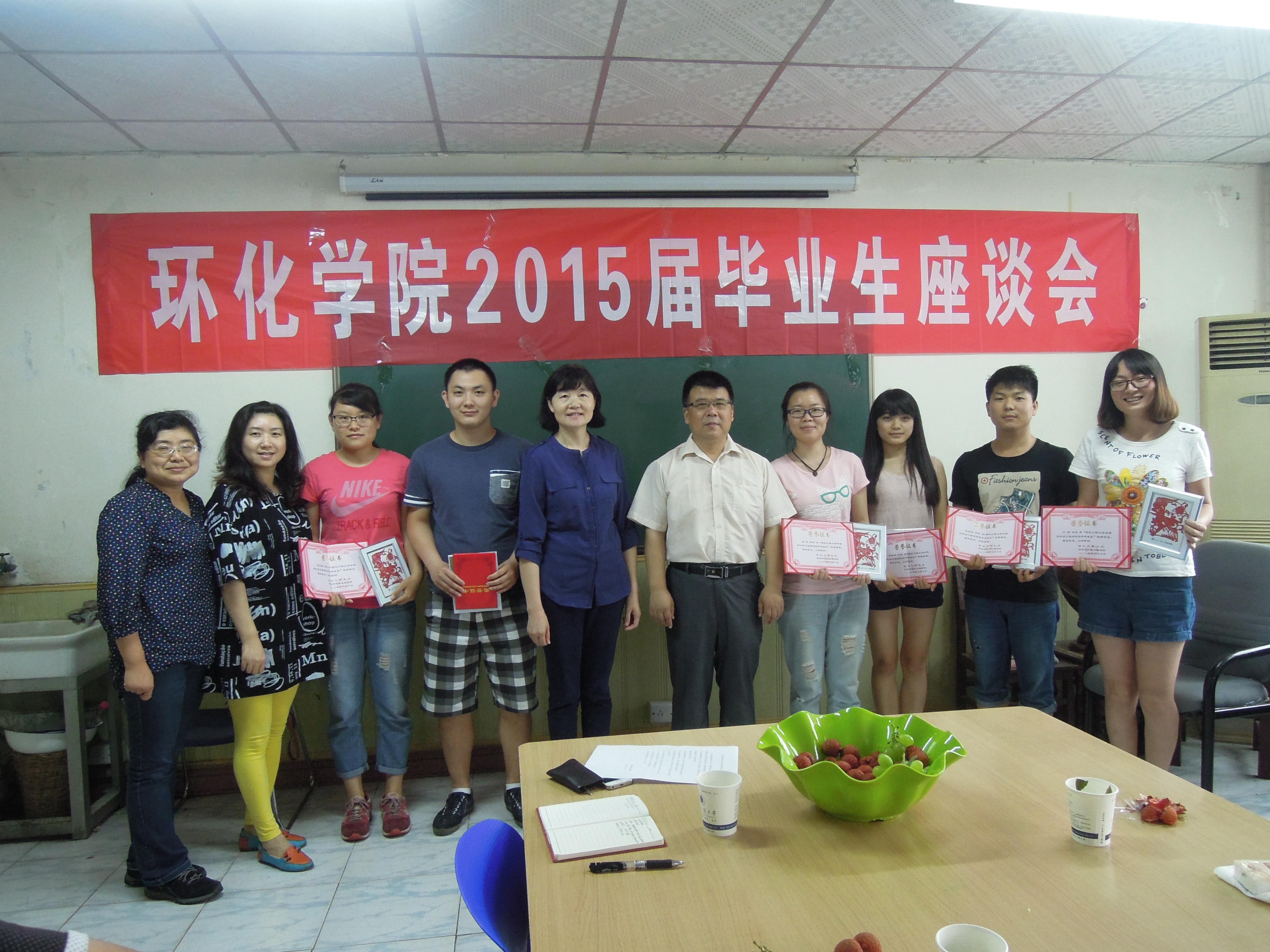 周飞副院长等与会老师都为毕业生送上了真挚的祝福,祝福2015届毕业生前程似锦。参加座谈会的学生就上学期间专业教育、考研、就业等方面提出了许多想法和建议,学生也通过一个个的在校经历,感受到学校的温暖,表达感谢学院、学校对他们的关心和培养之情。随后学院为毕业生颁发了荣誉证书和纪念品。