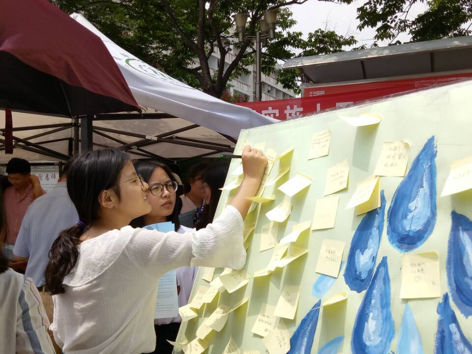 5月19号当天上午,在活动现场,广场节水宣传活动共分为五个板块:在图片展示区通过展板详细的给大学生展示了水在人们生活生产可持续发展中的重要性;在知识问答区学生们通过知识问答知晓了节约用水原来有很多的方法,并且自己就可以立即去做,同时对参加回答问题的学生有小纪念品;在寄语墙,同学们写下了对节约用水的决心和期望活动现场还有由“绿风”环保协会创作的节水诗歌,由主持人在广场朗诵,希望能呼吁更多的学生参加进来,来到活动现场的不少学生还在横幅上签下自己的名字,让节水理念通过更多的人传播出去。