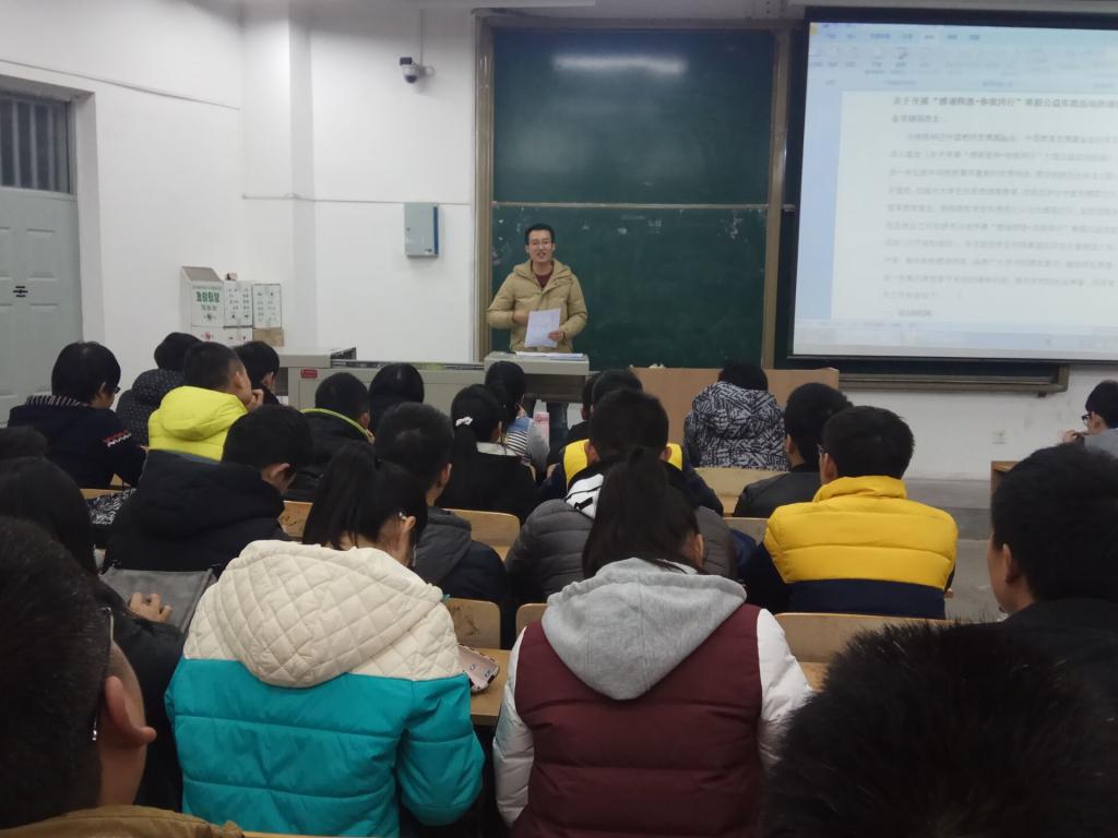 12月26日19点,yl6809永利官网在临潼校区B-135举办了“感谢师恩•你我同行”寒假公益动员大会,参加大会的有团学科主要干部以及16级全体学生,本次会议由王春元主持。