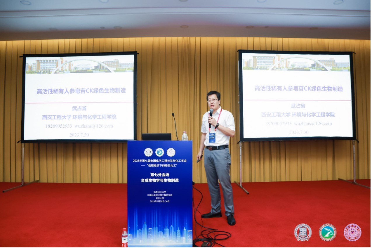 我院武占省教授受邀参会,并作邀请报告题为“高活性天然产物人参皂苷CK绿色生物制造”,该研究成果得到国家重点研发计划项目支持,一同参会的研究生有黄新健、曹珊珊、龙宏扬、李志燕都展示了研究墙报,显著提升了研究生学术视野和交流能力。整场报告贯彻了绿色低碳发展理念,加快建立健全低碳循环发展经济体系,发挥“化工+生物”对我国工业绿色可持续发展的支撑作用,推动学科间的交叉融合与交流合作,共同探讨了国际化学工程与生物化工教育与科学研究前沿问题,扩大国际交流合作,为推动形成新发展格局、共同落实全球发展倡议贡献科技力量。