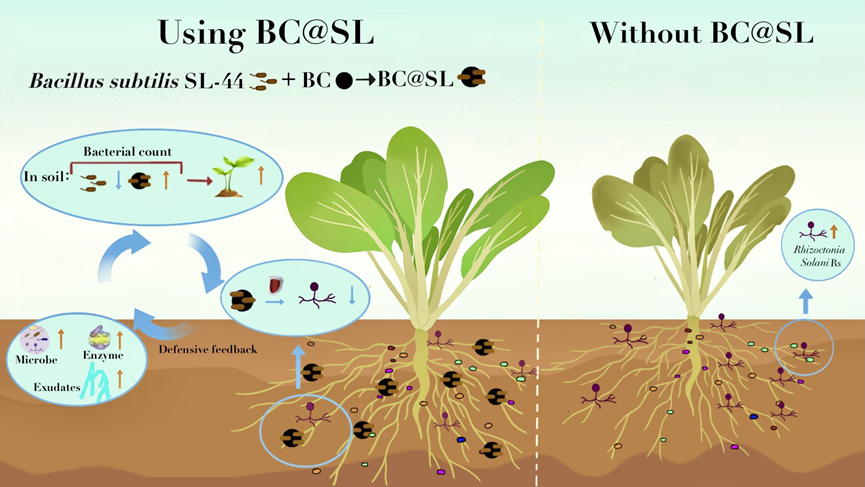 植物通过改变根系分泌物组成来重塑根系微生物群落的组成以抵御病害胁迫。为增强这一效应许多研究主张使用生物炭(BC)和外源微生物进行干预,以提高植物防御能力。然而,BC 介导外源微生物增强根系分泌物-土壤微生物防御反馈的机制仍不清楚。本研究制备生物炭基枯草芽孢杆菌 SL-44菌剂(BC@SL)来研究植物的防御反馈机制。BC@SL作为一种新型固体外源菌剂,与单一外源微生物菌剂相比具有稳定的理化性质和较长的贮存期,施用于土壤后解决了单一菌剂存活低的问题,并显著促进植物的生长,增强其抗病性。BC@SL 可通过直接抑制和防御反馈两种途径缓解立枯丝核菌Rs对植物的胁迫。BC@SL对防御反馈的优化主要通过增强植物抗性酶的活性(SOD提高3.5倍)、重塑微生物群落(芽孢杆菌 0.38%-16.31%)和调节渗出物(减少棕榈酸、硬脂酸、2-4-叔丁基苯酚,增加柠檬酸、苯甲酸)完成。研究表明,微生物对根系分泌物的代谢产物存在敏感性差异,BC@SL 优化植物根系分泌物的组成,使其更适合有益微生物的生长。此外,这些优化进一步增强了根系分泌物-土壤微生物防御反馈之间的正向调节。总之,BC@SL 是一种稳定高效的新型固体外源土添加剂,该研究为绿色农药的推广应用奠定了基础。