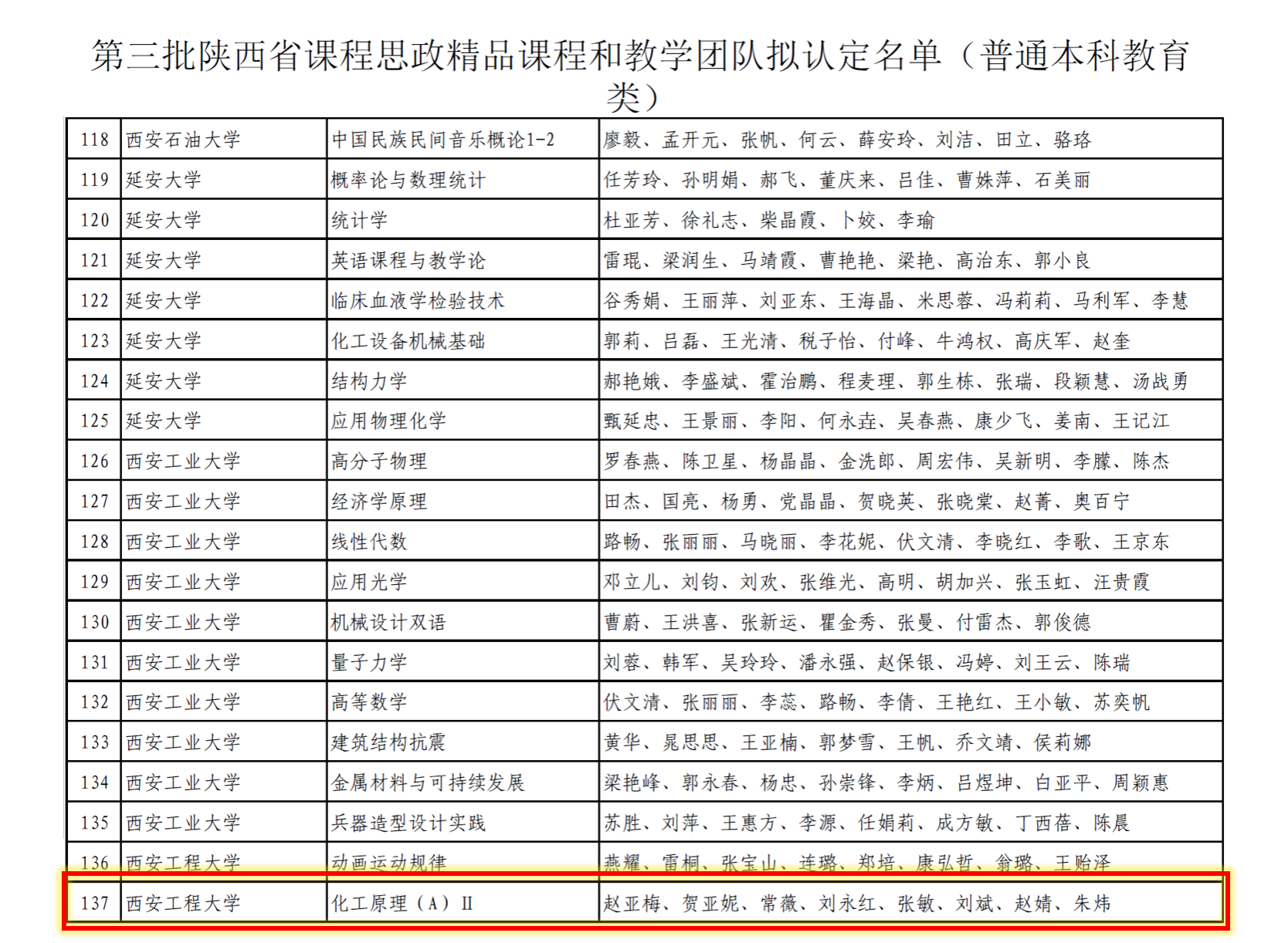 近日,陕西省教育厅公布了“第三批陕西省课程思政精品课程和教学团队拟认定名单”。我院赵亚梅教授团队讲授的《化工原理(A)II》课程成功获批陕西省课程思政精品课程。这是我院首个获批的省级课程思政示范项目,标志着我院课程思政建设工作迈上了新台阶。
