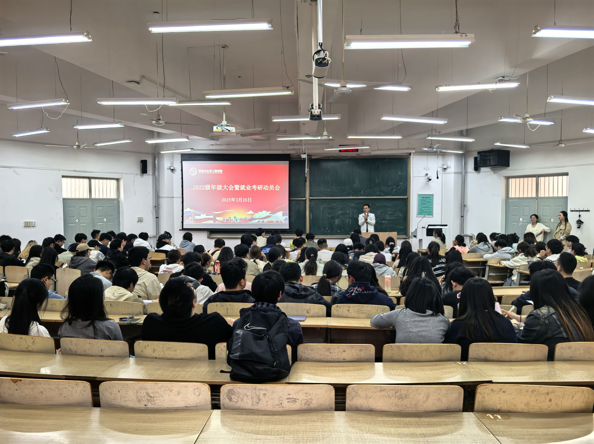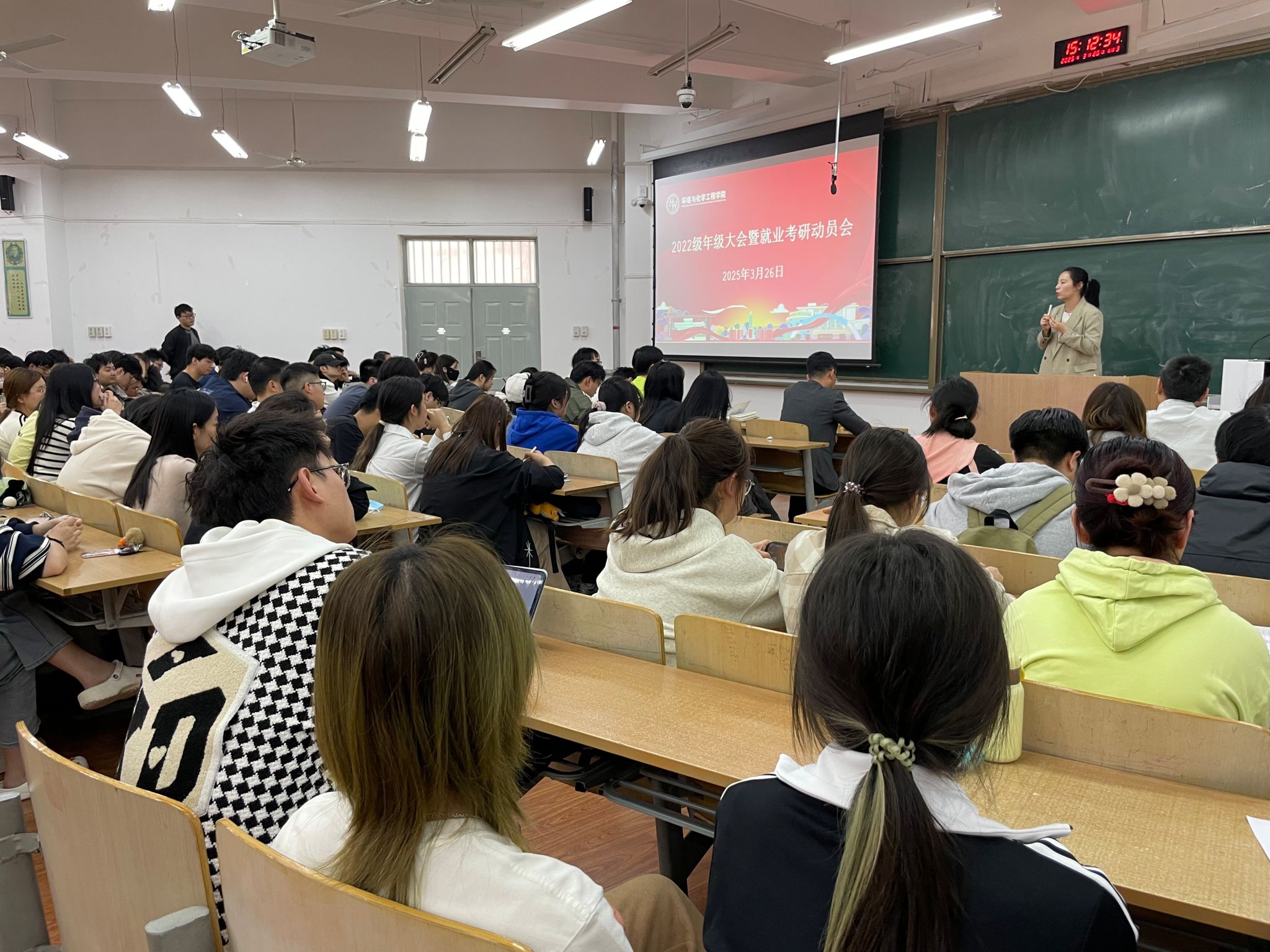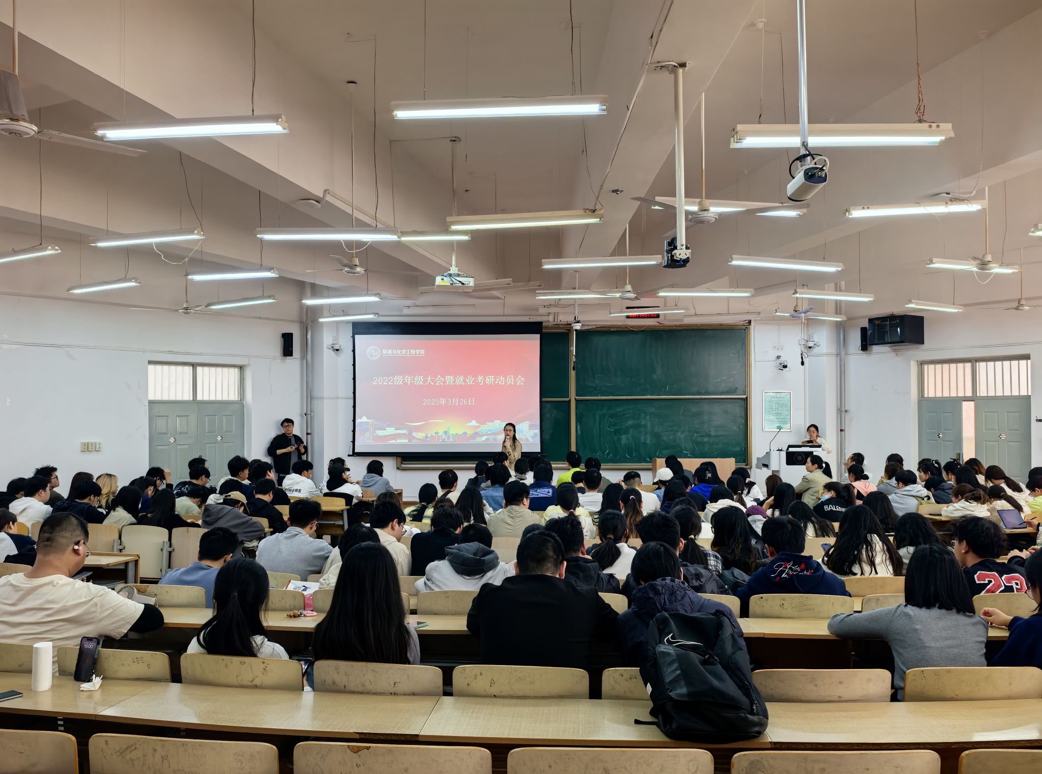 为增强学生安全意识、明确职业发展规划、激发考研备考动力,我院于3月26日下午在B栋教学楼233教室召开2022级年级大会暨考研动员大会。学院党委副书记林定武、学工办主任朱瑾、年级辅导员任子瑜及全体大三学生参加会议,会议由任子瑜主持。