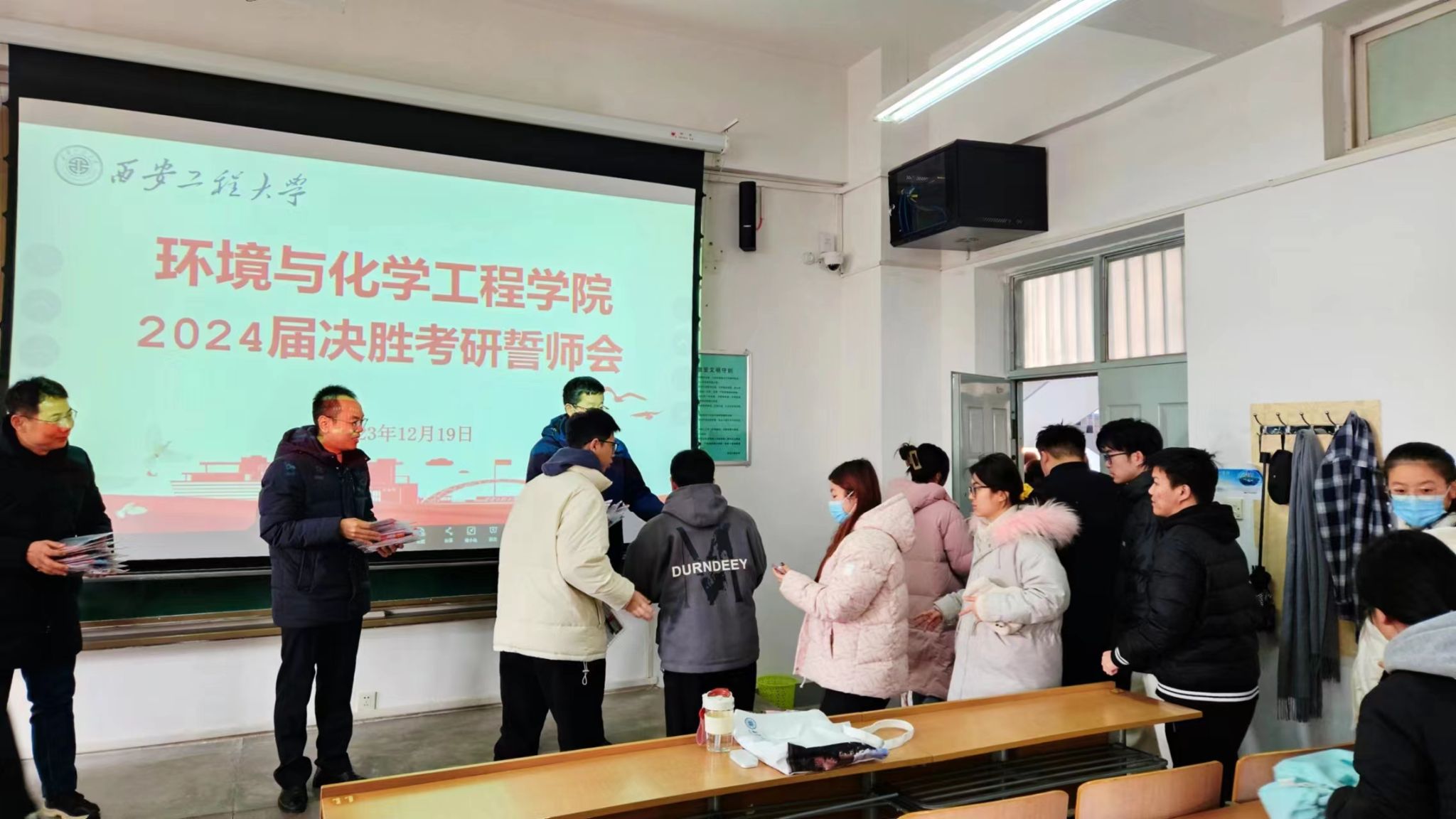 “研”途有你,未来可期。在2024年全国硕士研究生入学考试进入倒计时的最后阶段,为帮助考研学子增强信心,舒缓压力,以更加积极平和的心态迎接考试,我院于2023年12月19日在教学楼A-206举行2024届决胜考研誓师大会暨考研福袋发放仪式,学院党委书记胡西民、副院长(主持工作)武占省、副书记林定武、教务员耿倩、20级辅导员张易泽及2024届考研学生参与此次活动。