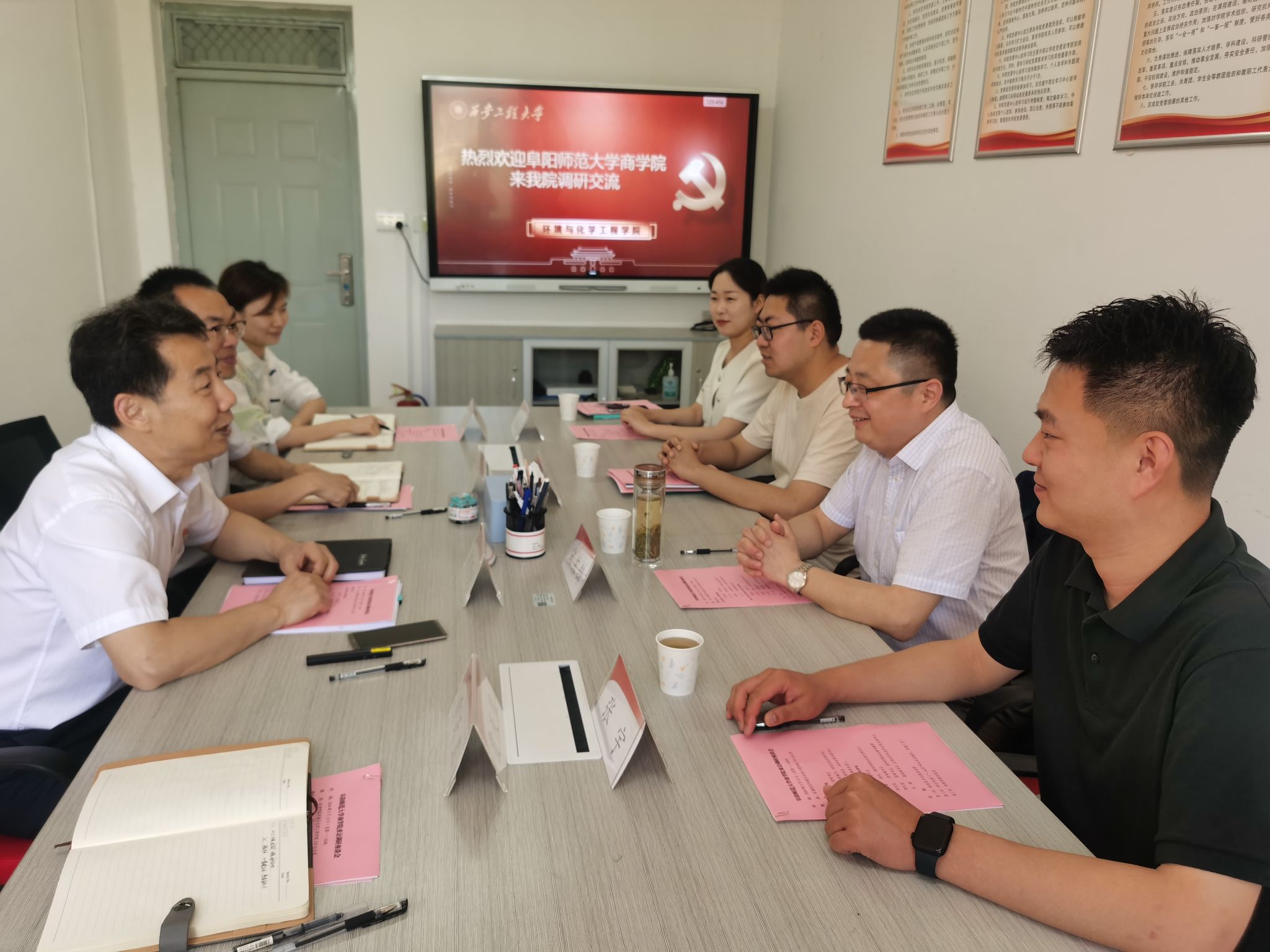 在座谈中,胡西民首先对阜阳师范大学商学院一行到来表示热烈欢迎,并简要介绍了学院的发展历程、学科建设、人才培养和科学研究等方面工作。他表示,学院绿风环保协会党支部目前正在创建全国党建样板支部,学院党委发挥政治核心作用,在教育、管理、监督党员和组织师生、宣传师生、凝聚师生、服务师生七个方面发挥坚强有力作用,党支部切实加强在顶层设计、党建引领、全员育人、阵地建设、服务保障等方面的工作落实,促进学院党建“双创”工作提质增效。贾天昱汇报了绿风环保协会近年来围绕践行习近平生态文明思想、助力实现“双碳”目标、常态开展志愿服务等工作情况。刘婧分享了学院党建“双创”工作实施过程中的心得体会、党建与业务融合发展的典型做法及成效等工作情况。