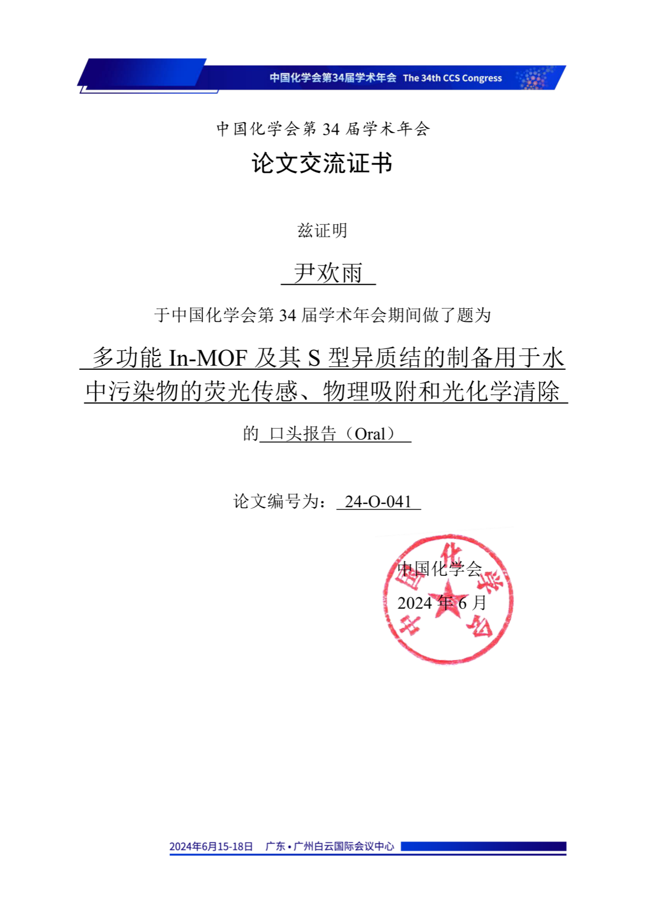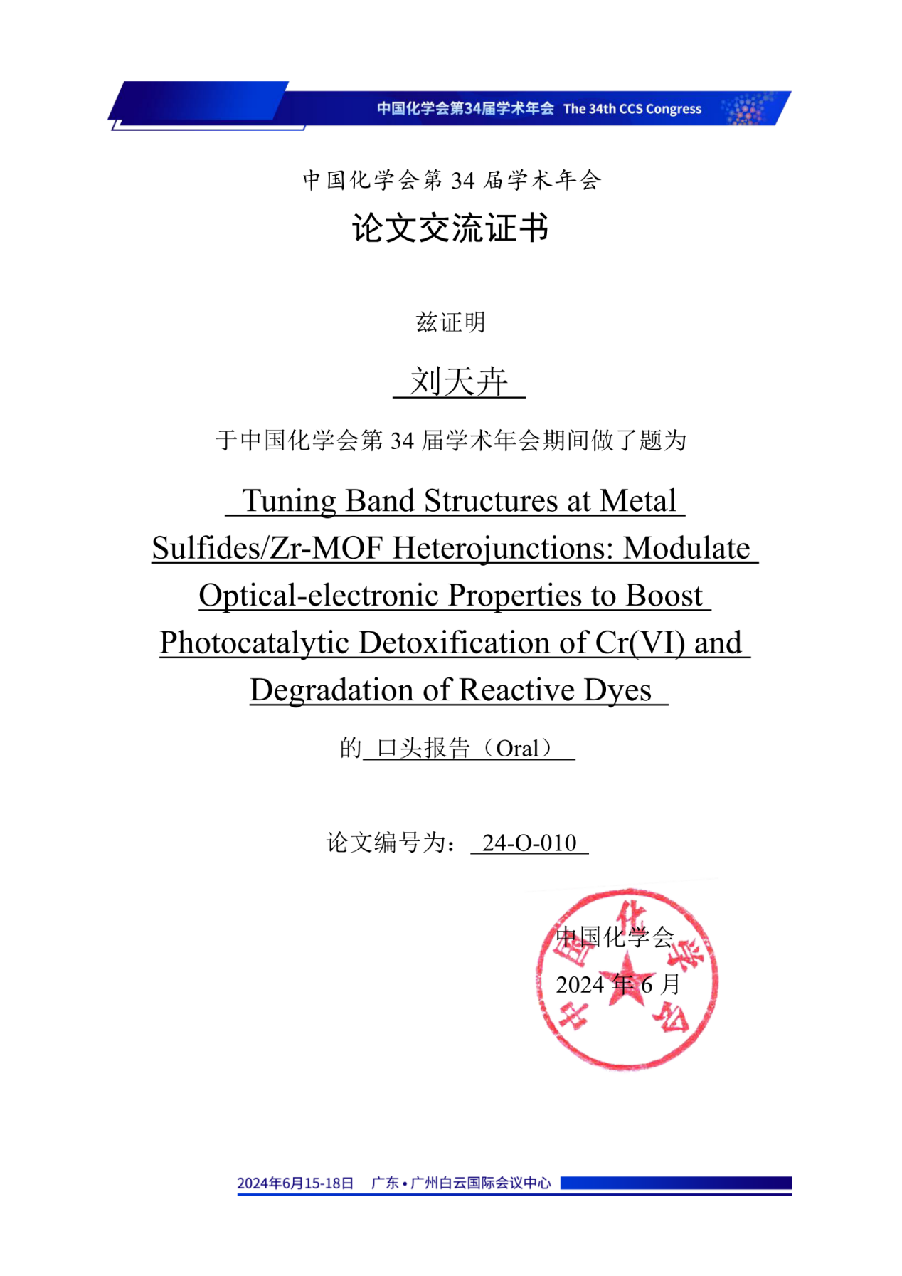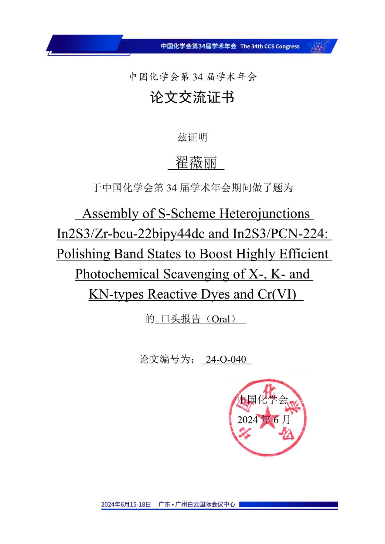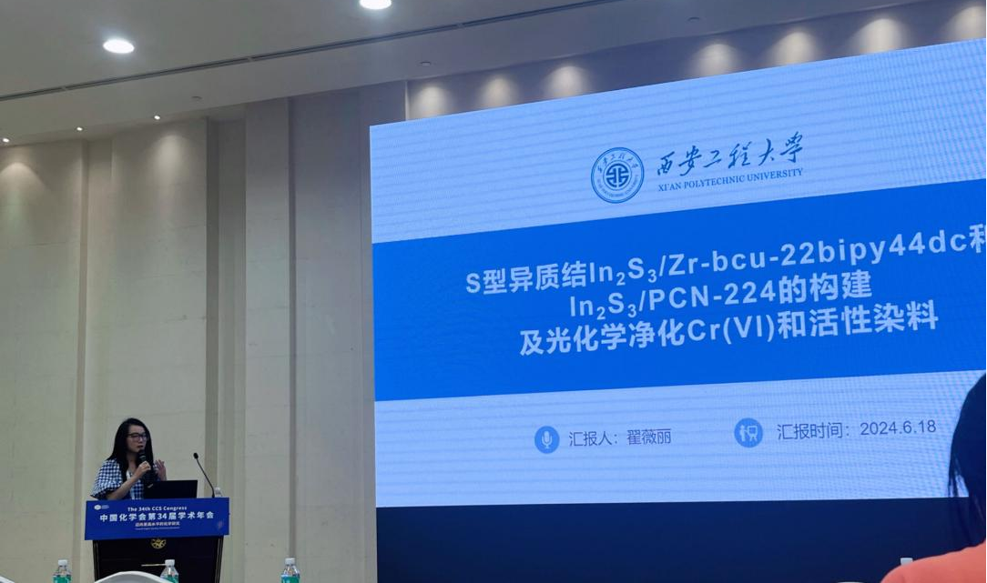我院李庆老师指导的2023级博士研究生翟薇丽,2021级硕士研究生刘天卉尹欢雨参会,在第二十四分会(功能晶态材料)做口头学术报告,报告题目分别为:“Assembly of S-Scheme Heterojunctions In2S3/Zr-bcu-22bipy44dc and In2S3/PCN-224: Polishing Band States to Boost Highly Efficient Photochemical Scavenging of X-, K- and KN-types Reactive Dyes and Cr(VI)”(翟薇丽)、“Tuning Band Structures at Metal Sulfides/Zr-MOF Heterojunctions:Modulate Optical-electronic Properties to Boost Photocatalytic Detoxification of Cr(VI) and Degradation of Reactive Dyes”(刘天卉)及“多功能In-MOF及其S型异质结的制备用于水中污染物的荧光传感、物理吸附和光化学清除”(尹欢雨),分享了课题组在新型MOFs基水处理材料研发,以及对纺织印染废水中常见重金属离子的荧光传感检测、有机及无机污染物的光化学清除方面的研究进展,并同与会专家学者进行了交流和讨论,展示了我校化学工程与技术、纺织科学与工程学科在相关研究领域的学术研究水平。